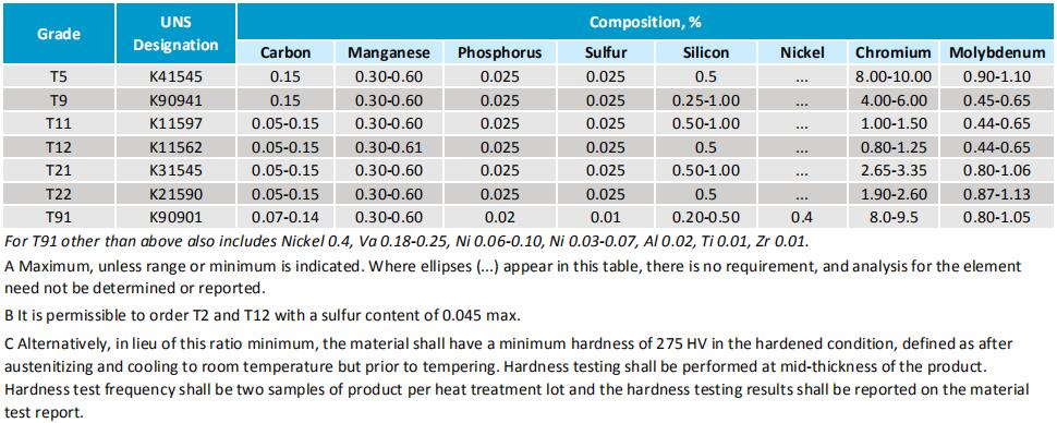 SA213 T22 Alloy Steel Seamless Tubes Chemical Composition